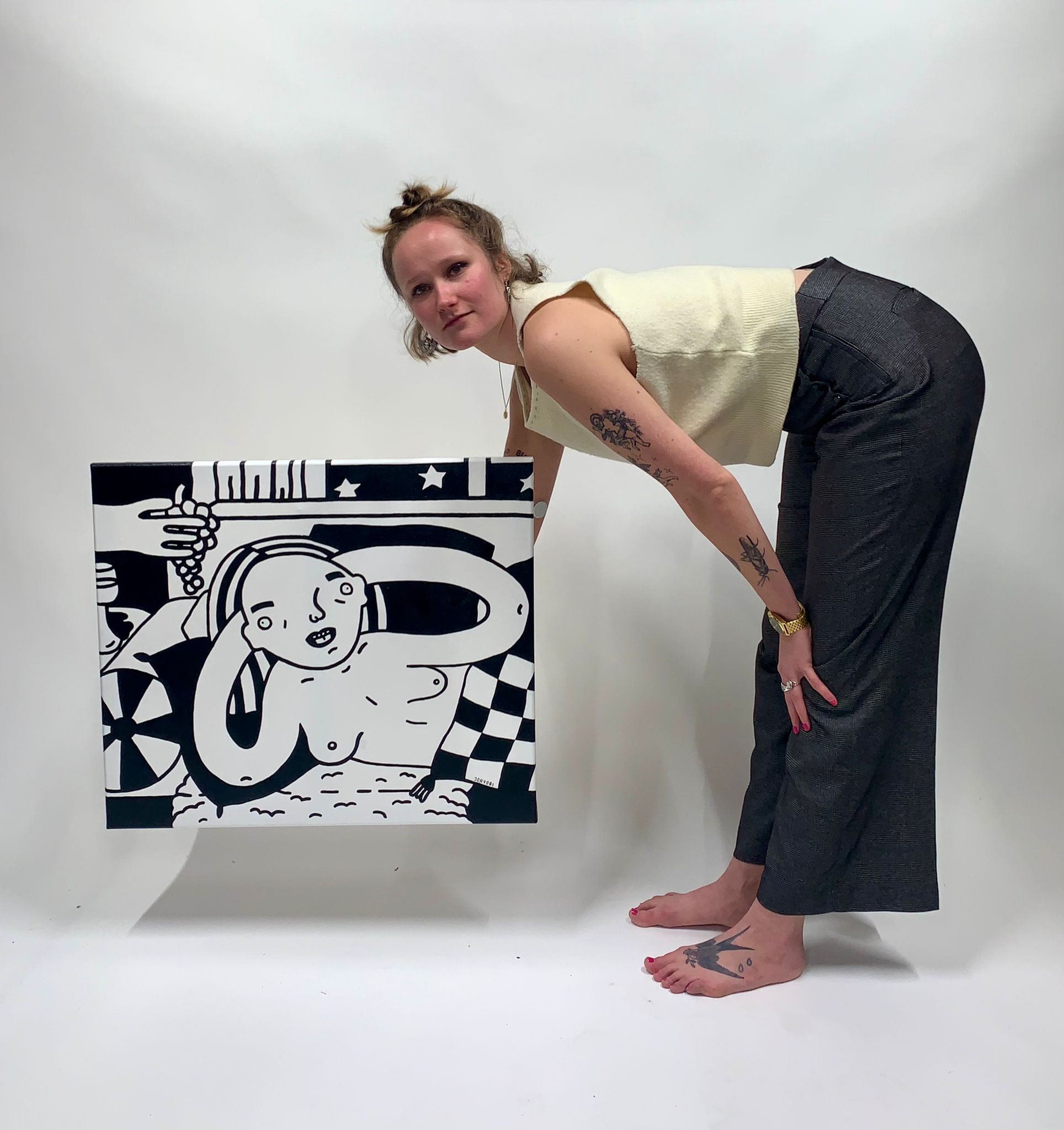 (because it’s no fun if you already know what you’re drawing beforehand). The result is these strange characters full of self loathing and anxiety but always with a twist of hope and comedy. ‘You’re just always drawing yourself’ She has recently picked up animation and plans to start tattooing her doodles in the near future.