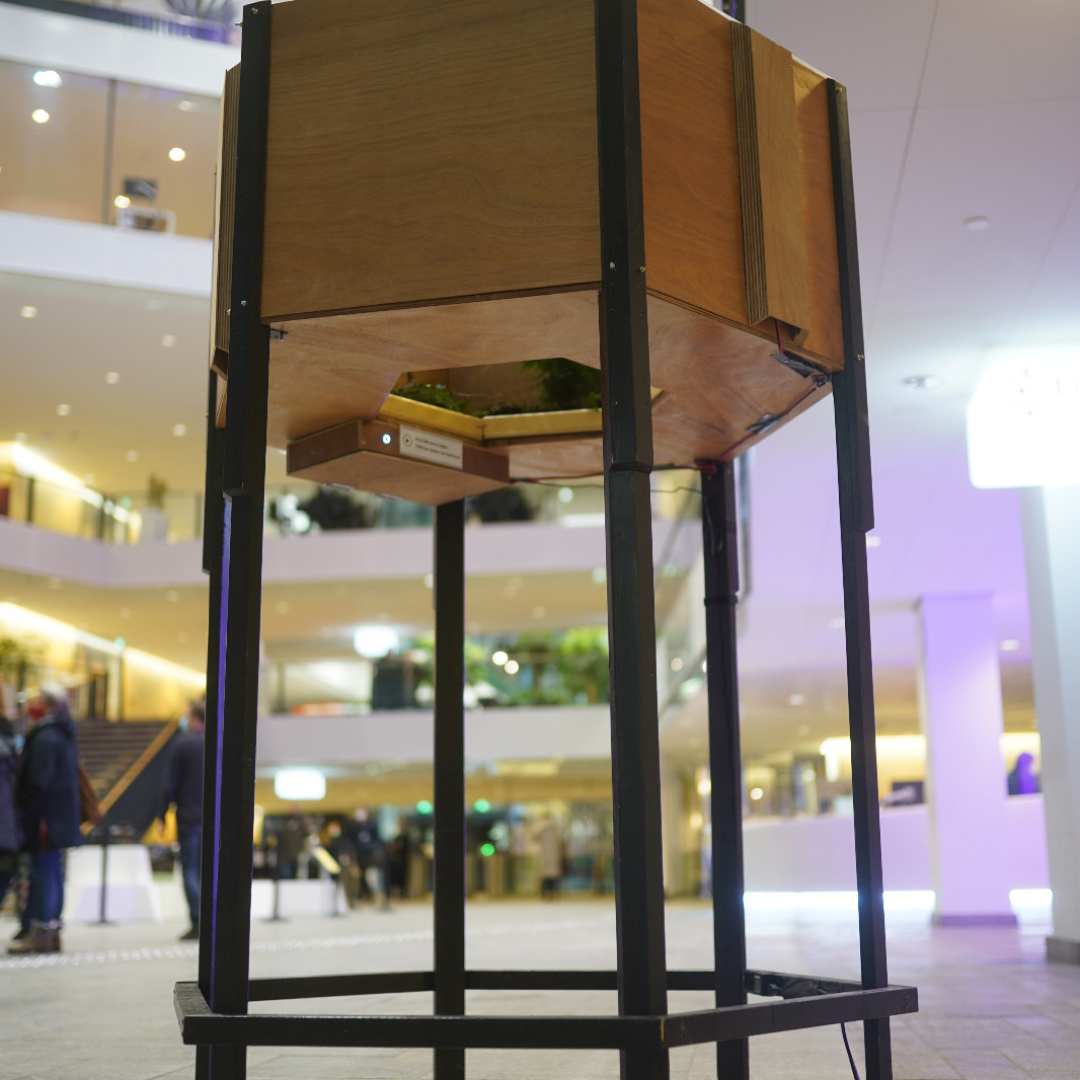 Bringing the concept of a circular economy to life via an immersive experience in collaboration with media-artist Felipe von Dobschütz-da Silva.The hexagon consists of an open platform that can be filled with a variety of themed objects (e.g. plants, waste materials). The structure is mounted, so viewers can experience the landscape at eye-level by placing their heads within the terrarium-like structure.